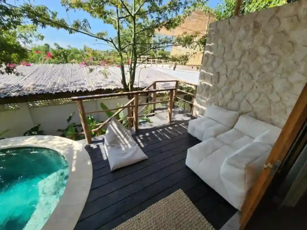 The property comprises five one‑bedroom villas and one two‑bedroom villa, all featuring private plunge pools, air‑conditioned interiors, and spacious lounges. Key perks include elegant bathrooms, in‑villa dining, access to Banana Lounge’s pool and restaurant, and a setting surrounded by mature tropical landscaping that feels calm and secluded despite the central Bingin location. The combination of thoughtful service, polished contemporary comfort, and a prime spot near world‑class surf beaches is why Jellyfish Villas made our list.